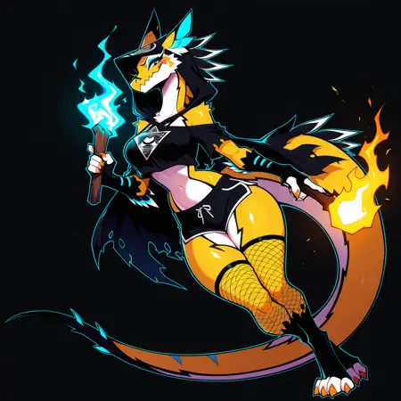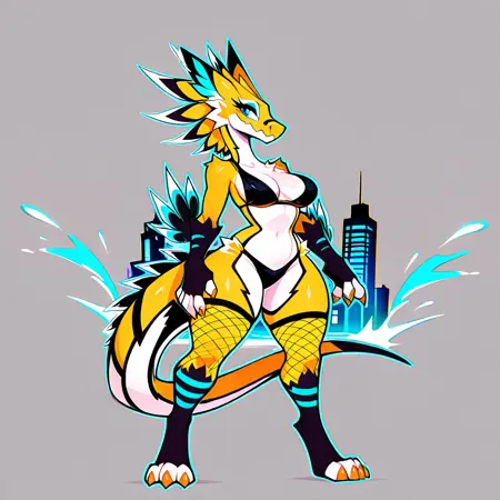 no humans, harbringer, 1girl, scalie female, animal ears, two-tone skin, yellow body, blue eyeshadow, orange claws, multicolored feathers, fur, tail, fishnets on legs, stripes, black scales on legs, black bikini