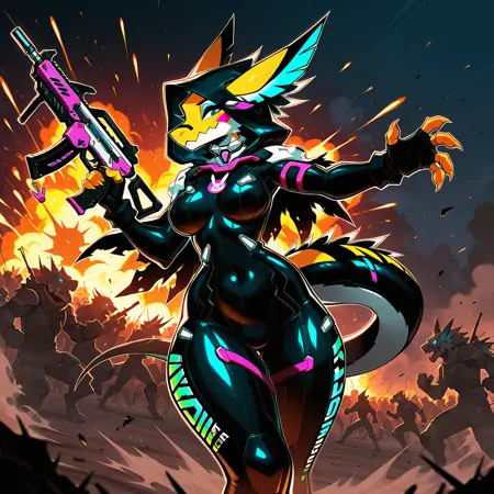 no humans, harbringer, 1girl, scalie female, animal ears, two-tone skin, yellow body, blue eyeshadow, orange claws, multicolored feathers, stripes, d_va bodysuit