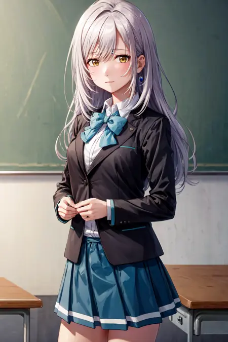 ((best quality, high quality, masterpiece, highres)), hitomi tsukishiro, 1girl, solo, school uniform, black jacket, blue skirt, blue bowtie, looking at viewer, jewelry, classroom, school