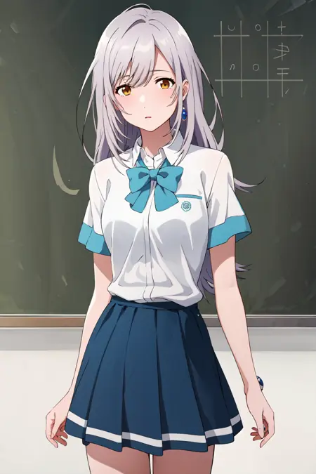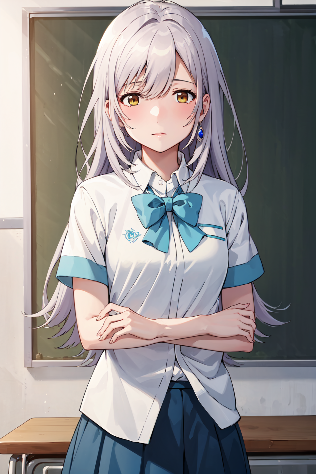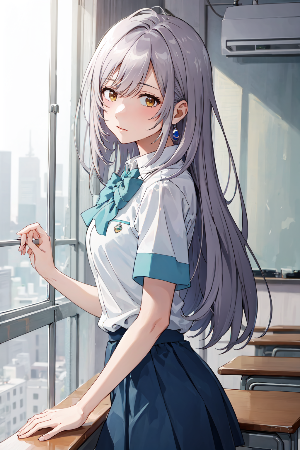 ((best quality, high quality, masterpiece, highres)), hitomi tsukishiro, 1girl, solo, school uniform, white shirt, blue skirt, looking at viewer, jewelry, classroom, school