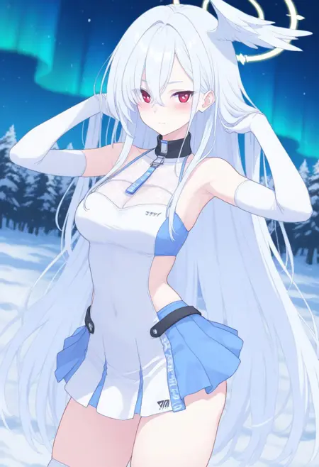 ブルー・チアララ衣装、取り外し可能なカラー、白いカラー、青いネックウェア、小さなネックウェア、クロスレースビキニ、ツートーンビキニ、青いビキニ、白いビキニ、プリントビキニ、肩出し、鎖骨、バストライン、お腹、へそ、プリーツスカート、ツートーンスカート、白いスカート、青いスカート、メカニカル太ももストラップ、白い太ももストラップ、白い手袋、アームレット、指先部分なし手袋、ブライダルガントレット