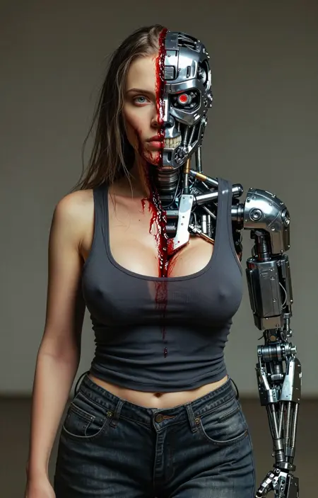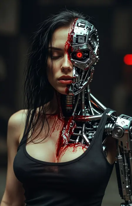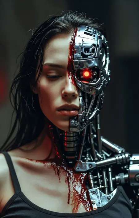 トリガー:半機械顔、zitt800、t-800、1girl、solo、リアルistic、黒髪、機械部品、血、長髪、アンドロイド、サイボーグ、損傷、赤い目、唇、胸、SF、鎖骨、胸元、ポートレート、発光、サイバーパンク、鼻、閉じた口、キャミソール、閉じた目