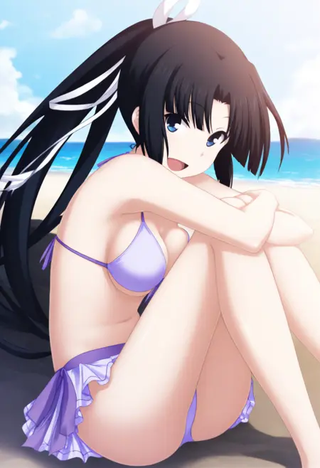 majikoi_youshitsune,black hair,blue eyes,long hair,very long hair,ponytail,sidelocks,ribbon,parted bangs, blunt bangs,hair intakes, white ribbon,hair ribbon,youshitsune_bikini,swimsuit,bikini,light purple bikini,underboob, bikini skirt,front-tie top, side-tie bikini bottom,bow,purple bow,thigh gap
