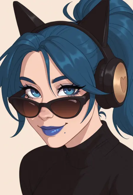 衣装タグ:猫耳ヘッドフォン、サングラス、色付き眼鏡、黒枠眼鏡、黒ジャケット、開いたジャケット、短めのジャケット、黒シャツ、衣装カットアウト、クロップトップ、お腹、へそ、黒手袋、指なし手袋、黒パンツ、青いベルト、太ももホルスター