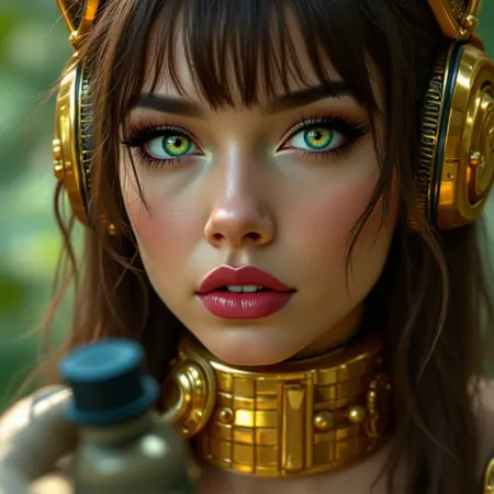금색 목걸이, 주사기를 들고 있는, 청동 헤드셋, 애니메이션 풍의 풍부한 존 8K 숲, 호랑이 머리장식과 녹색 눈을 가진 여인의 클로즈업, 사이버펑크 스타일, 하이퍼리얼리스틱, 이집트 고양이 여신, 정교한 미래형 LED 보석, 날카로운 시선, 초세밀한 여성 안드로이드, 디지털 판타지 아트, 스틸 초커, 분홍 로자, 디아블로 4 리릴ith