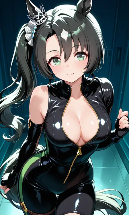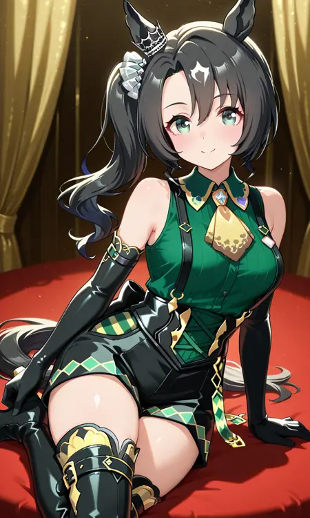 satono crown,horse girl,horse tail,horse ears,short hair,long hair,side ponytail,one side up,white hair,hair between eyes,black hair,green eyes,hair ornament,ear ornament,breast, médium breasts,thighs,