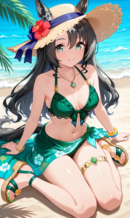 horse ears, long hair, horse tail, navel, necklace, ears through headwear, smile, toenails, multicolored sandals, collarbone, white hatband straw hat, bare shoulders, hibiscus print gradient sarong, hibiscus print green bikini tops, single thighlet, mismatched bracelet, blue ear ribbon, toenail polish, sunny island splendor,
