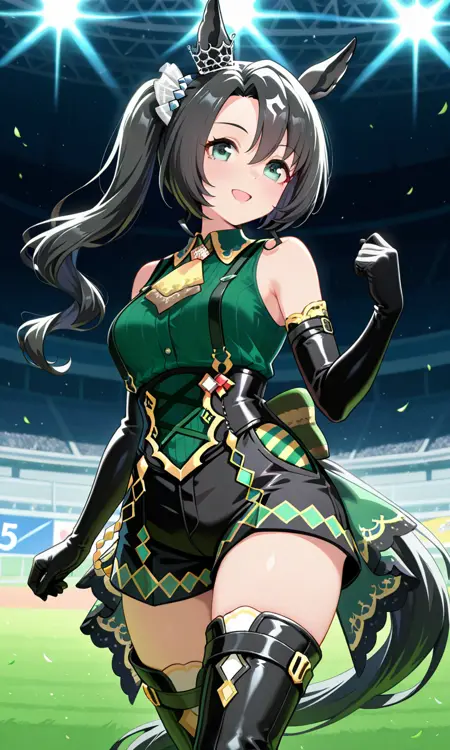horse ears, black elbow gloves, sleeveless green shirt, horse tail, black shorts, yellow ascot, black suspenders, black pantyhose, black thigh boots, bare shoulders, hair scrunchie, ear ornament, mini crown,side ponytail