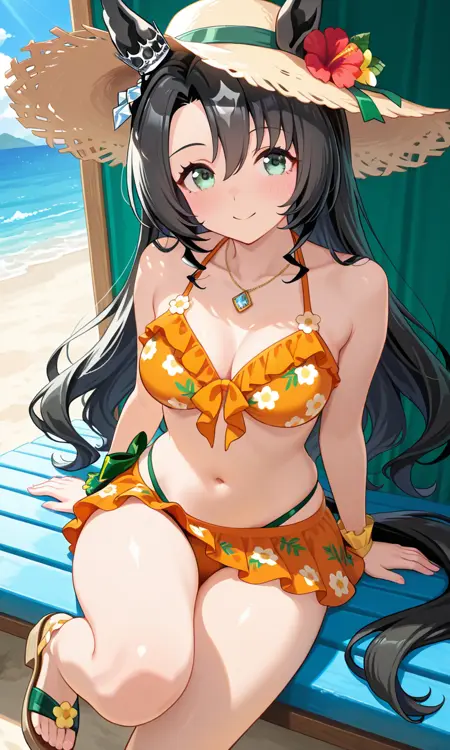 horse ears, long hair, horse tail, navel, necklace, ears through headwear, smile, toenails, multicolored sandals, collarbone, white hatband straw hat, bare shoulders, hibiscus print gradient sarong, hibiscus print green bikini tops, single thighlet, mismatched bracelet, blue ear ribbon, toenail polish, sunny island splendor, yellow bikini bottom