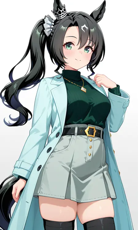 horse ears, horse tail, solid black thighhighs, long sleeves, open coat, black slim belt, mini crown, hair scrunchie, casual, dark blue turtleneck sweater, gold pendant necklace, light blue coat, grey high-waist skirt, ear ornament, mini crown,side