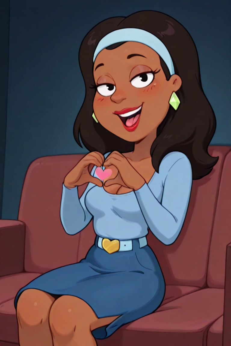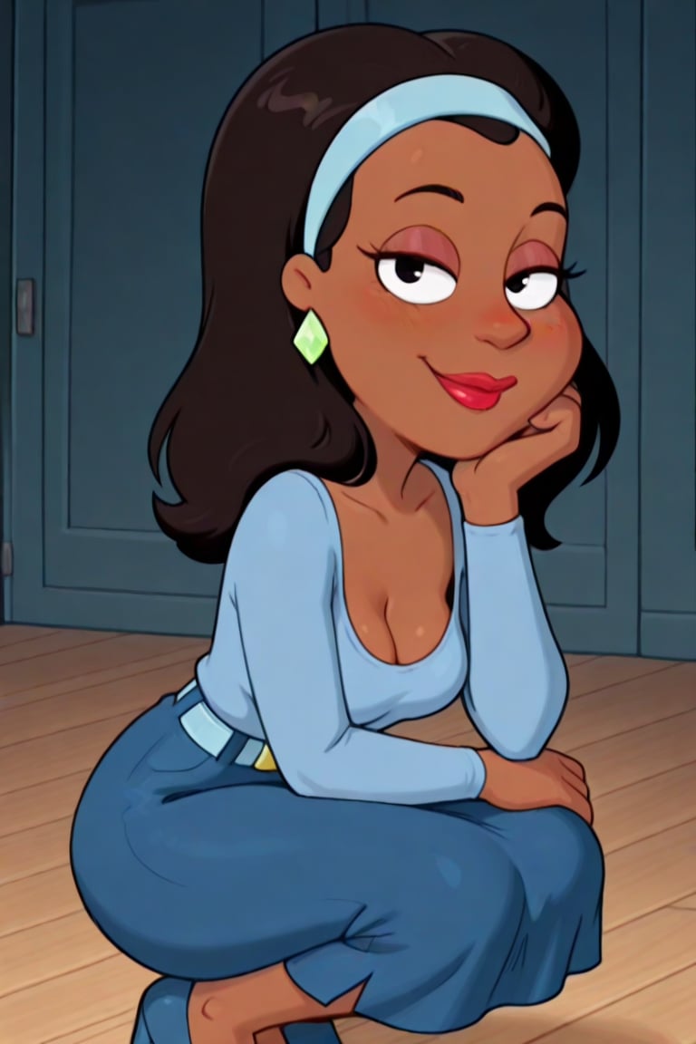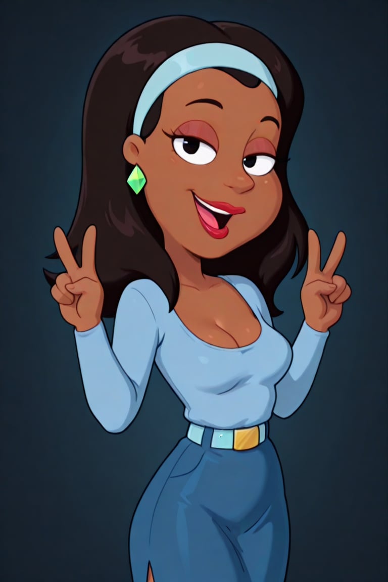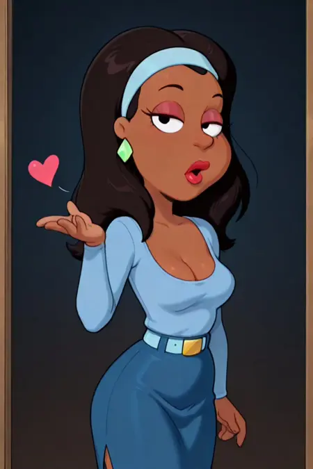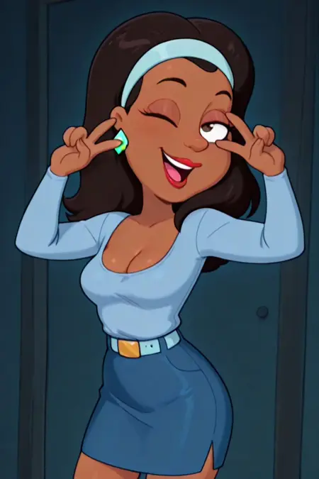 아프리카계 미국인, 진한 갈색 피부, 어깨 길이의 검은 머리, 빨간 립스틱, 두꺼운 입술, 밝은 파란색 긴 소매 피팅 상의, 낮은 네크라인, 파란 치마, 밝은 파란색 벨트, 금색 벨트 버클, 어두운 파란색 무릎 위 부츠, 밝은 파란색 헤드밴드, 밝은 녹색 다이아몬드 귀걸이