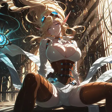 HXHjanna,big breasts,cleavage,long hair,floating hair,goggles on head,goggles,pointy ears,blonde hair,steampunk,corset,multicolored clothes,floating clothes,thighhighs,