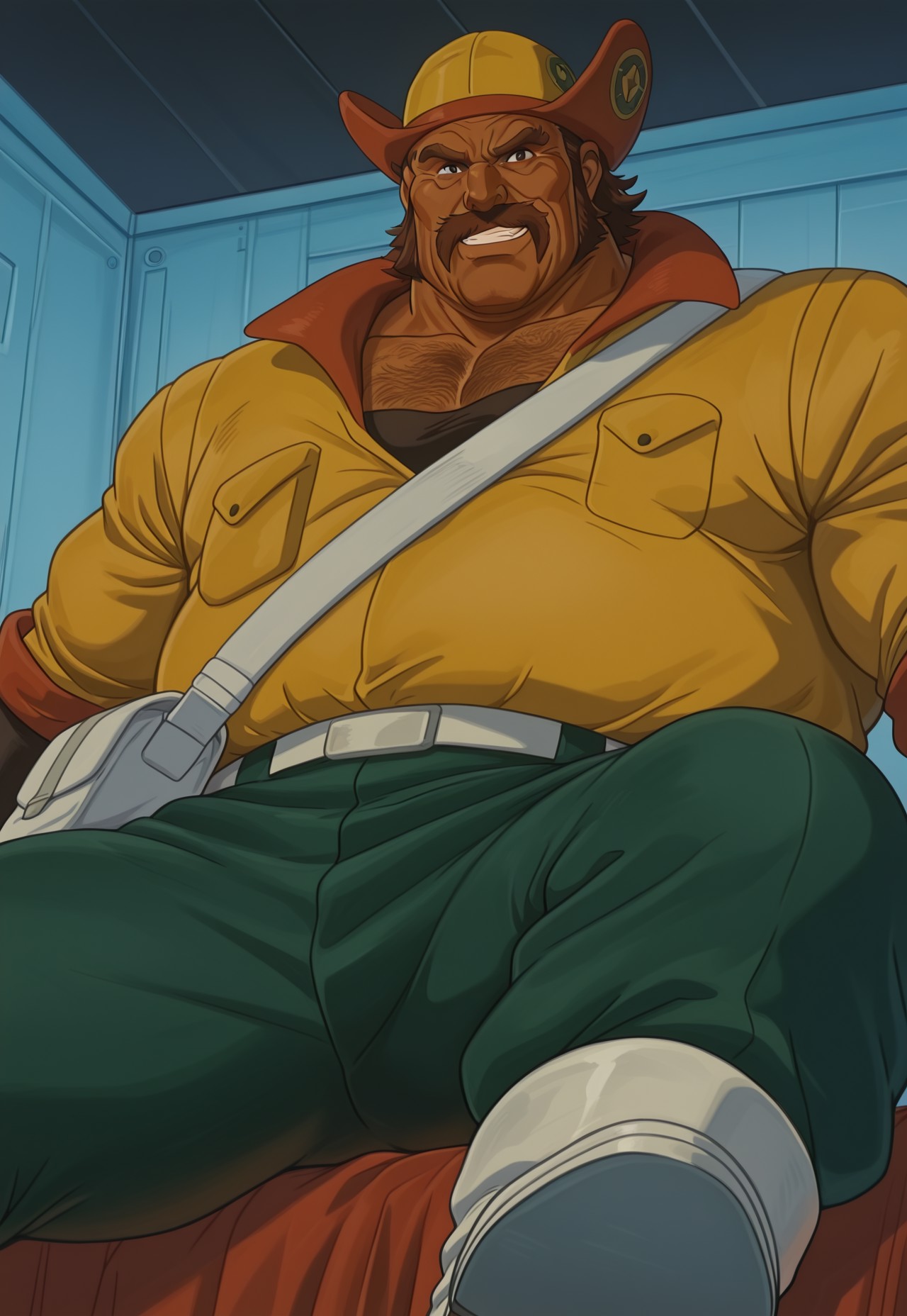 H0nd4, old man, wrinkled face, only mustache, brown hair, brown skin, black eyes, fat, chubby, obese
