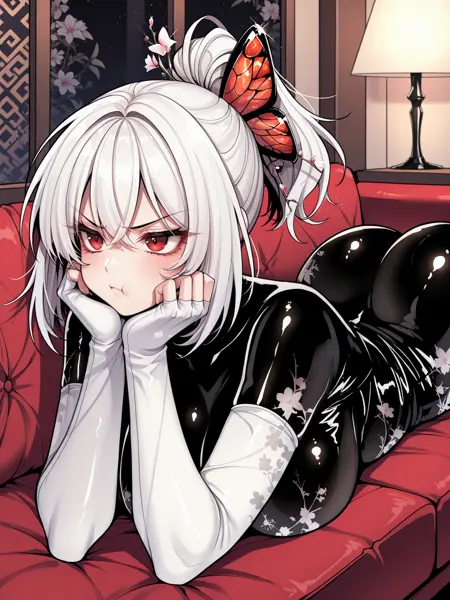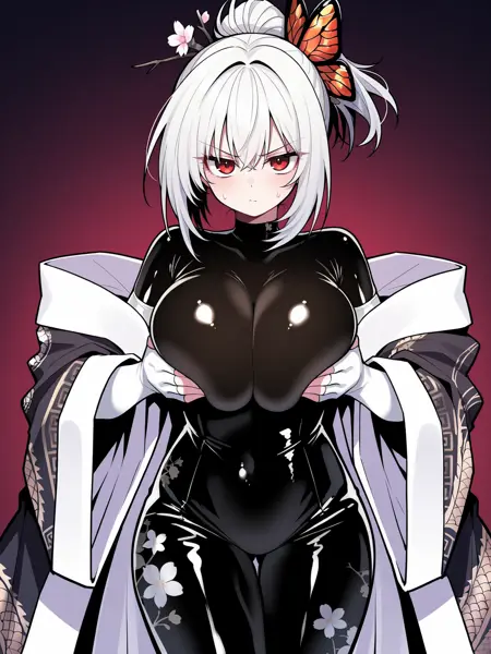Apperance: baekdoil, white hair, short hair, high ponytail, red eyes, butterfly hair ornament, flower hair stick, large breasts