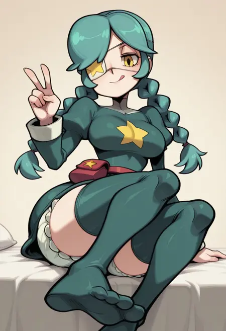 <Lora:AnnieOTSSGGX:1>, yellow eye, star eyepatch, green hair, twin braids, large breasts