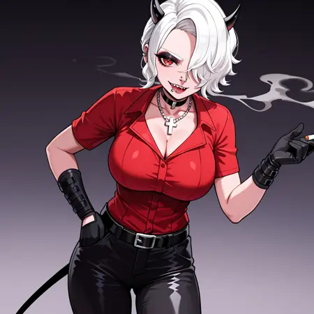 - 煙付きトリガー: ZdradaSmoke, 1girl, 黒い角, 赤いシャツ, 大きな胸, 赤い目, 白髪, ジュエリー, タバコ, デーモンの角, 片目を覆う髪, 十字架のネックレス, 黒いチョーカー, 尖った歯, 黒いベルト, デーモンガール, 黒い手袋, 黒いパンツ, 吸煙, 鼻のピアス, 短い髪, アイシャドウ, 胸元, メイク, 唇のピアス, 短い袖