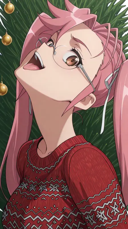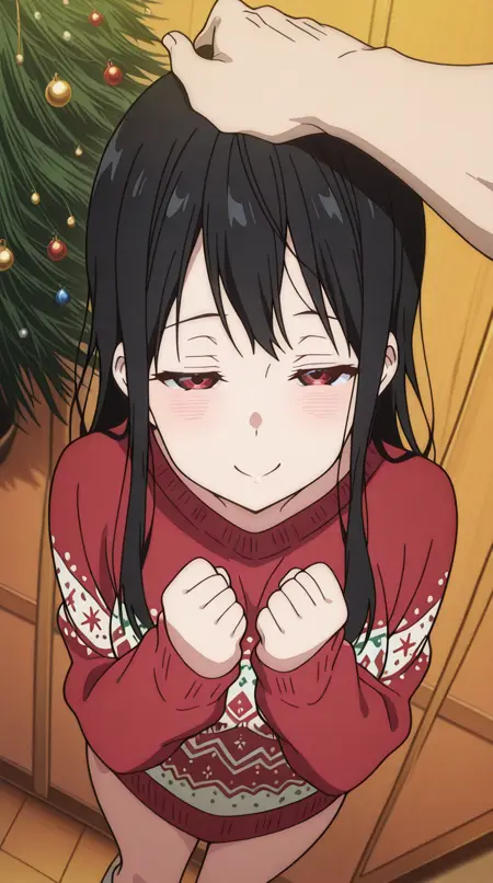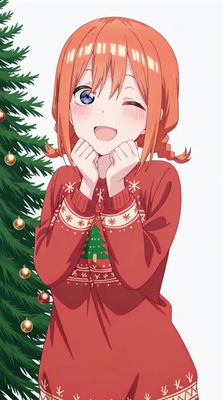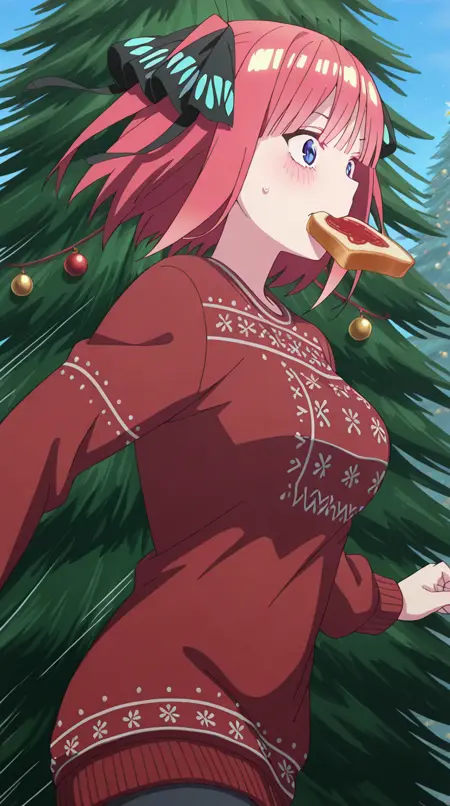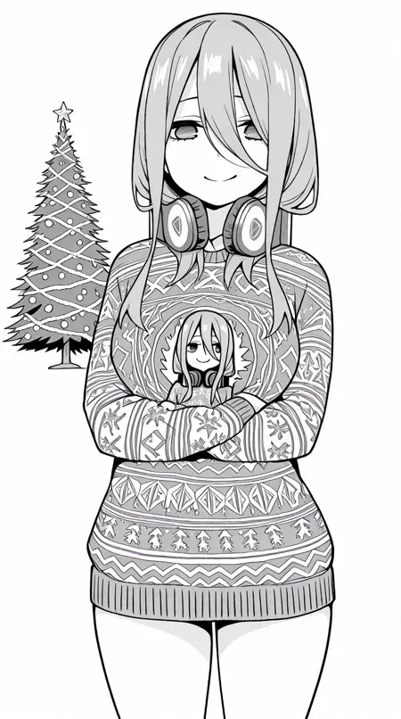 lora:christmas-sweater-illustriousxl-lora-nochekaiser:1, 크리스마스 스웨터, 크리스마스, 추한 스웨터, 프린트 스웨터, 빨간 스웨터, 크리스마스 트리, 크리스마스 장식, 스웨터, 다색 스웨터,