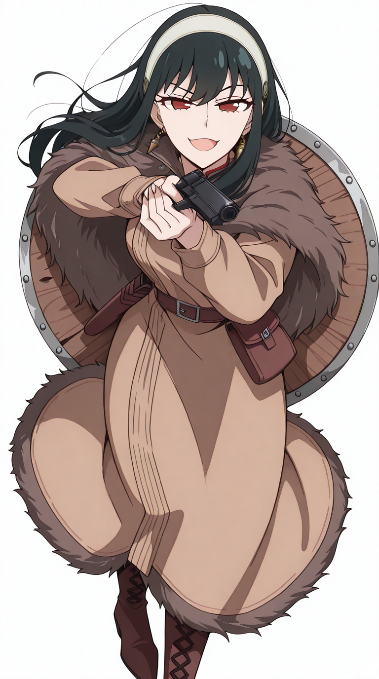 lora:viking-illustriousxl-lora-nochekaiser:1, viking, fur cloak, leather belt, leather boots, sword, round shield, medieval clothing, solo