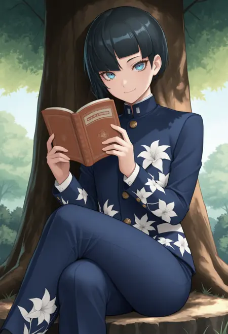 For Human protag it's "smtvpro, bob cut, blunt bangs, black hair, blue eyes, single sidelock, school uniform, blue pants, floral print, long sleeves, androgynous"
