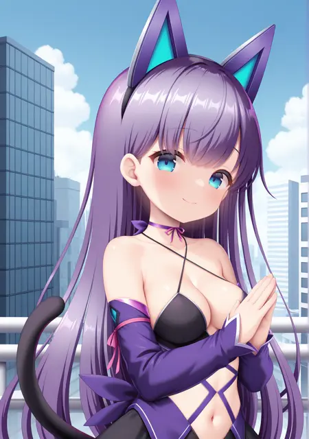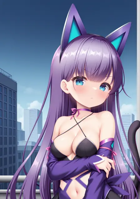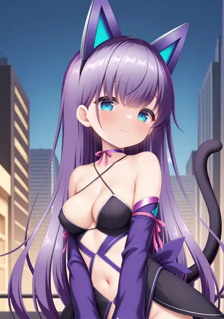 권장: 보라색 머리카락, 매우 긴 머리카락, 파란 눈, 어깨 노출, 견갑골, 중간 크기의 가슴, 가슴 사이, 배꼽, 고양이 귀, 가상의 동물 귀, 고양이 꼬리, 가상의 꼬리, 분홍색 리본, 다리 리본, 분리된 소매, 긴 소매, 보라색 소매, 보라색 허벅지 양말, 반짝이는 다리 착용, 허벅지 스트랩, 검은 신발, 메리 제인, 검은 치마, 배꼽 컷아웃, 십자형 허리 끈, 리본 초커, 보라색 초커, 소매가 손목을 넘음, 허벅지 리본, 분홍색 허벅지 양말,
