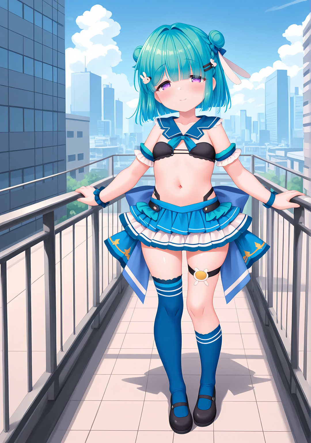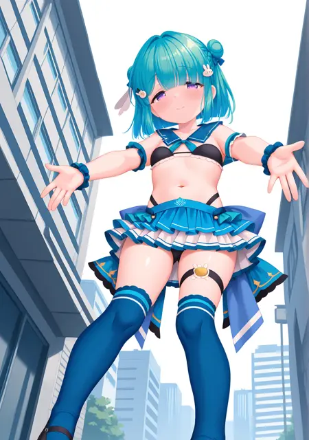 推奨:アクアヘア、青髪、緑髪、紫目、ショートヘア、編み込み、二つ結び、髪の結び目、鎖骨、へそ、裸の肩、ブラックビキニ、青いセーラー襟、青いスカート、白いスカート、プリーツスカート、フリルスカート、レイヤードスカート、黒い靴、ローファー、青いスパッツ、フリル付きスパッツ、非対称な脚元装飾、不一致な脚元装飾、膝上より長い靴下、腕ガーター、太ももストラップ、青いリボン、髪のリボン、ウサギの髪飾り、手首のスクランチ、ブランチの前髪、髪飾り、ヘアクリップ、ハイレグビキニ、青い靴下、背中のリボン、メアリージェーンズ、手首の cuffs、
