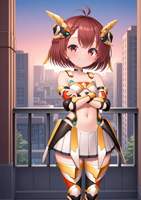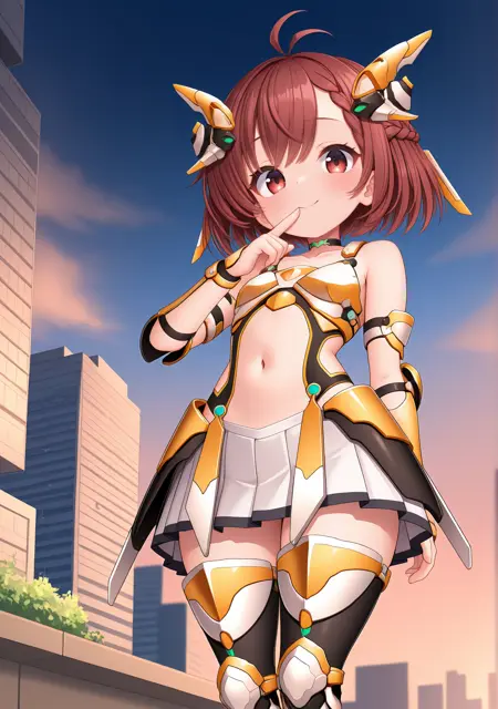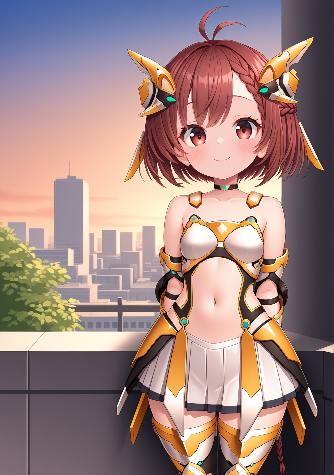 recommend:red brown hair,brown eyes,red eyes,short hair,braid,ahoge,antenna hair,bare shoulders,collarbone,miniskirt,pleated skirt,white skirt,zettai ryouiki,armor,headgear,armored boots,thigh boots,black thighhighs,french braid,braided bangs,navel,stomach cutout,choker,thighhighs under boots,