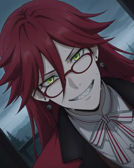 boy, sharp teeth, very long hair, vibrant red hair, oval glasses, green eyes, pale skin, feminine facial features, wears a white collared shirt, bow with red/white stripes, brown vest, long dark red trench coat, black tailored pants, black gloves, black and red dress shoes, silver chain accessory attached to the pants,