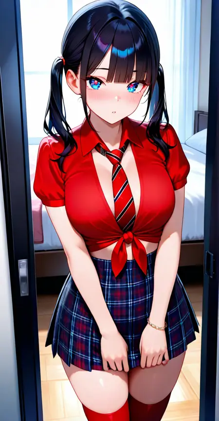 xg1, red thighhighs, plaid skirt, striped necktie, tied shirt, short sleeves, red shirt, jewelry, bracelet