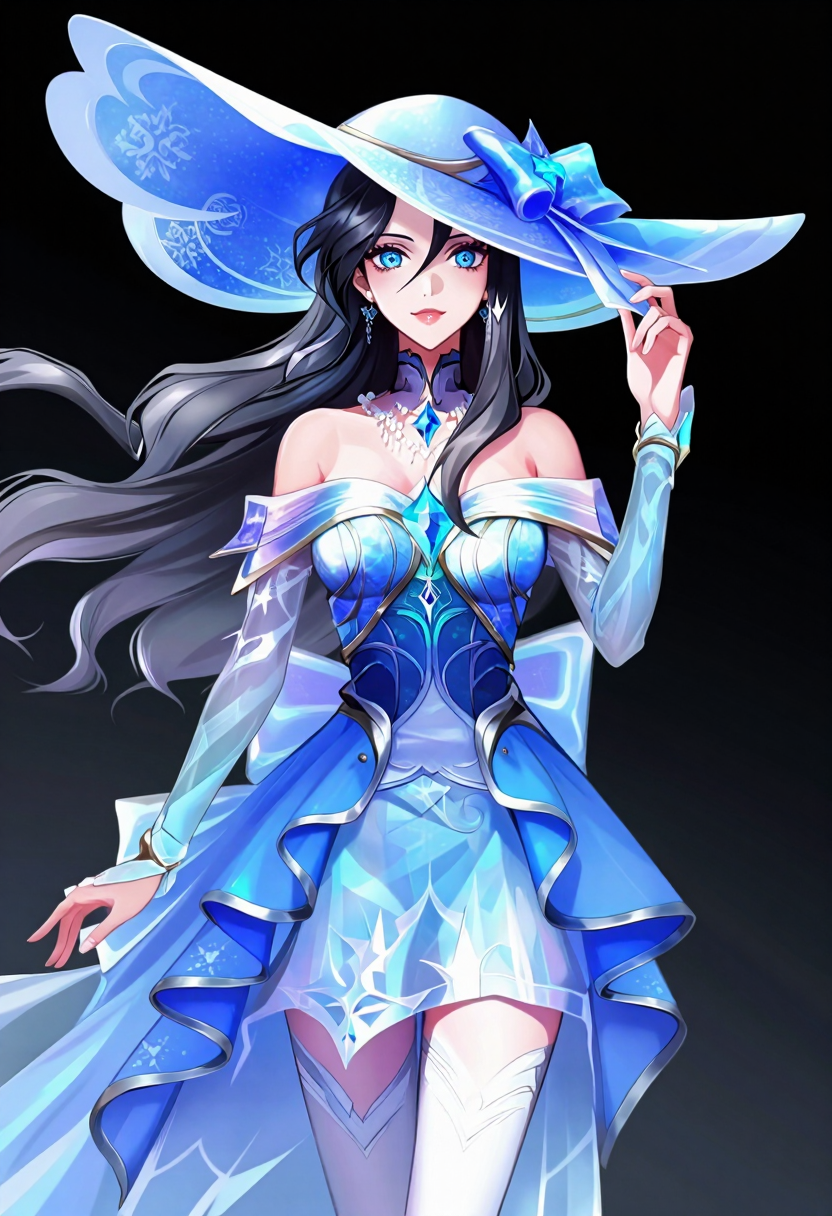 Main tags: Crystal rose, caitlyn, long hair, blue dress, hat,bare shoulders, black hair, long sleeves,