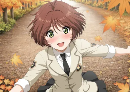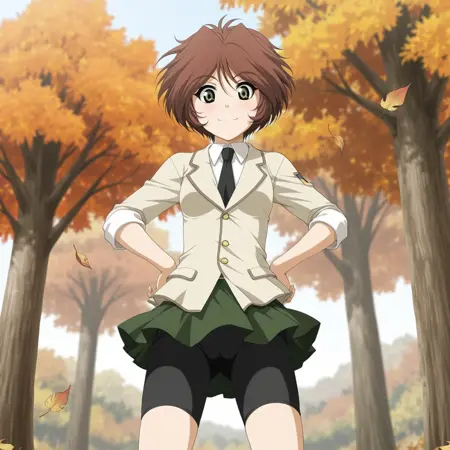 tenjin_haduki,short hair,brown hair,small breasts,black necktie,beige blazer,sleeves rolled up,emblem,green skirt,bike shorts under skirt,white ankle socks,red sneakers