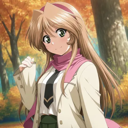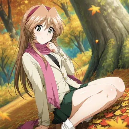 tenjin_kaduki,long hair,light brown hair,tareme,small breasts, black necktie,beige blazer,emblem,green skirt,pink scarf,long scarf,smile,scarf over breast,brown footwear,white ankle socks