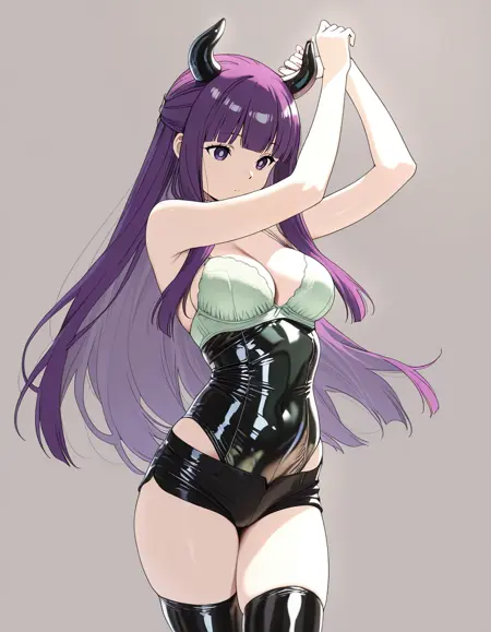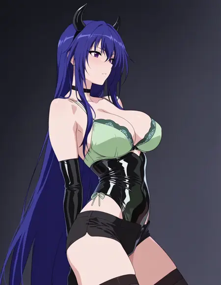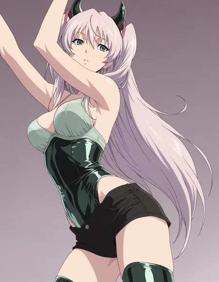 mai_latex_leotard,fake_horns,green_bra,black_shorts,thighhighs,bare_shoulders