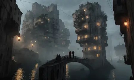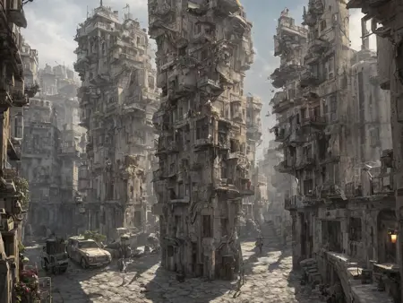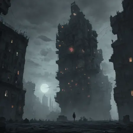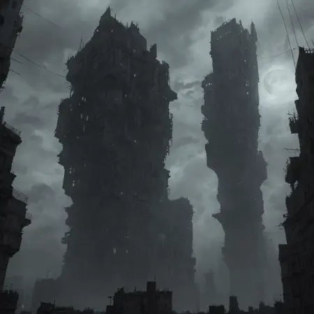 This embedding will invoke the works of an architect, who has clearly lost all of his marbles. Nightmarish city scapes, grim and dark, with buildings glued together in chaotic manner, defying laws of physics and common sense.