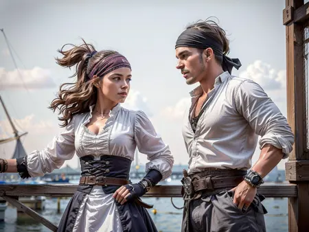 First out the of the gate. Came out a little too Johnny Deppy, if you know what I mean. Still tends to consistently deliver credible looking pirate captains, mates and women pirates. Made a mistake and baked this with a dimension of 9 and an alpha of 1. But I like the results. I'm going to experiment with using lower dimensions and alphas in the future. Works with the trigger keyword p1r4t3s, but you can omit it for different effects. The other keywords are "captain", "mate", and "female". Don't use the word "pirate" in your prompt or you will get a bunch of dorky cheesy pirate costume dreck that is in the base models.