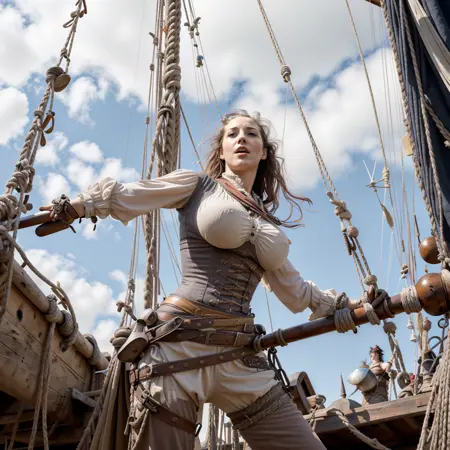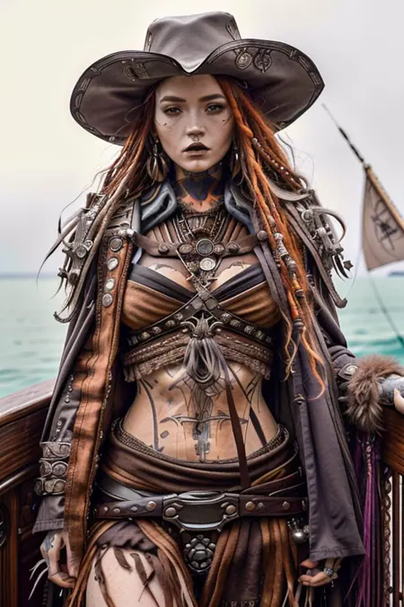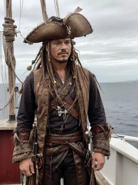 First out the of the gate. Came out a little too Johnny Deppy, if you know what I mean. Still tends to consistently deliver credible looking pirate captains, mates and women pirates. Made a mistake and baked this with a dimension of 9 and an alpha of 1. But I like the results. I'm going to experiment with using lower dimensions and alphas in the future. Works with the trigger keyword p1r4t3s, but you can omit it for different effects. The other keywords are "captain", "mate", and "female". Don't use the word "pirate" in your prompt or you will get a bunch of dorky cheesy pirate costume dreck that is in the base models.