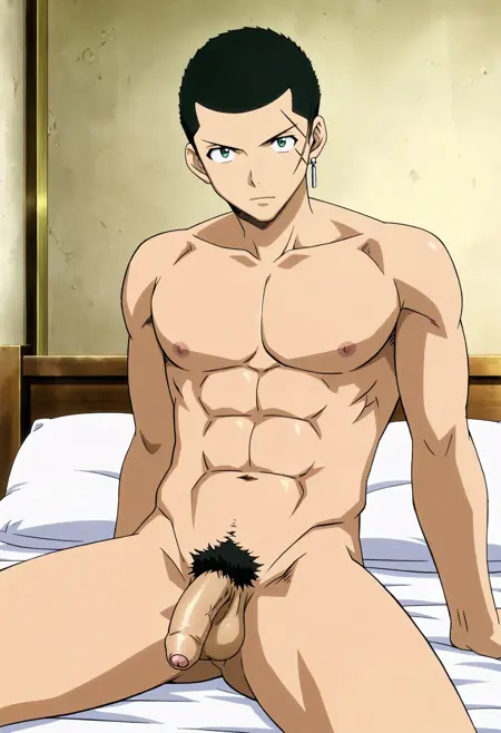 mest_gryder,black hair,green eyes,scar on left side of face,earring on left ear