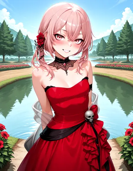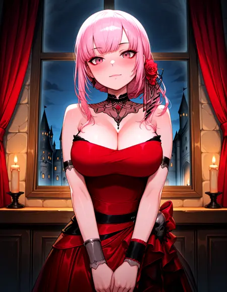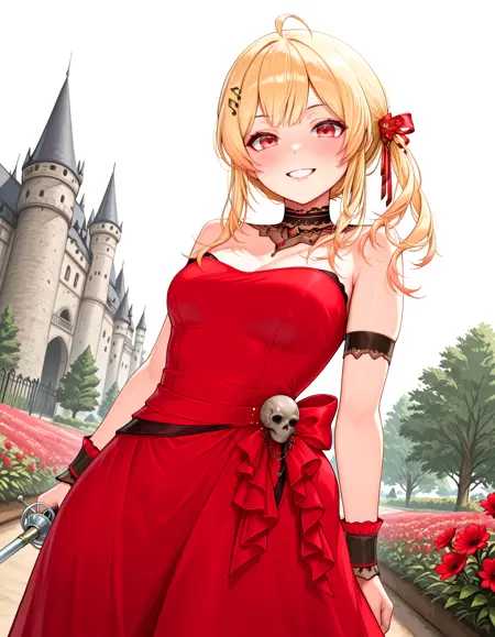MCPD3C, 빨간 드레스, 스트랩 없는 드레스, 긴 드레스, 머리 장식, 머리 꽃, 빨간 꽃, 어깨 노출, 분리형 칼라, 손목 팔찌, 팔 끈, 손목 밴드, 초커, 레이스 장식 초커, 해골, 리본, 보석