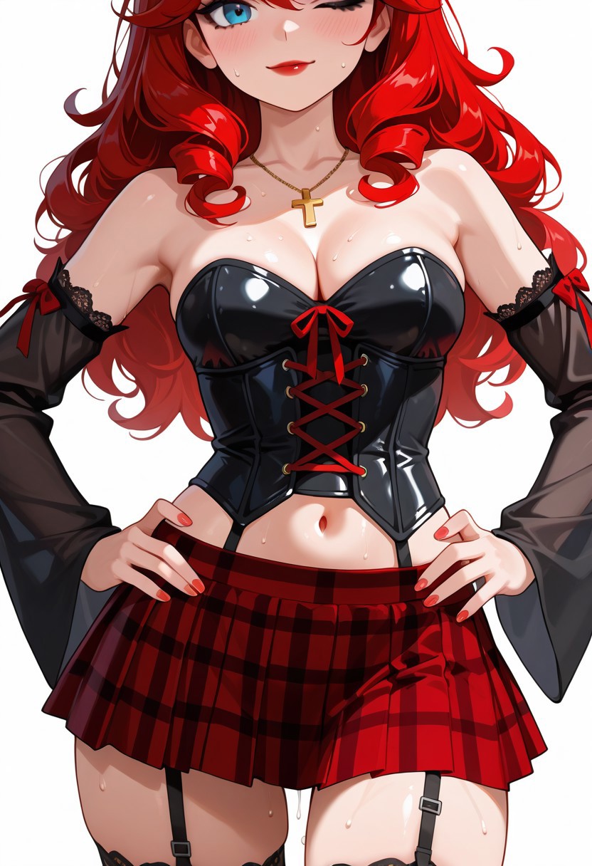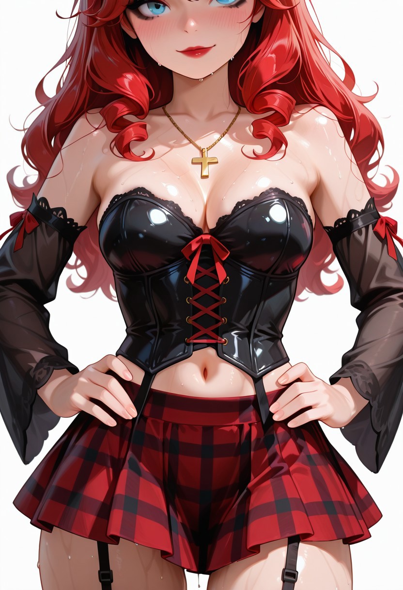 | トレーニングワード | 1girl, 21 years old, 1 girl, red hair, long hair, curly hair, blue eyes, black eyeliner, red lipstick, bang,コピーしました! (girl clothes :(cross necklace, lace-up corset, strapless, detached sleeves, transparent black sleeves, black corset, navel, black and red plaid mini skirt, garter belt, cleavage)コピーしました! |
