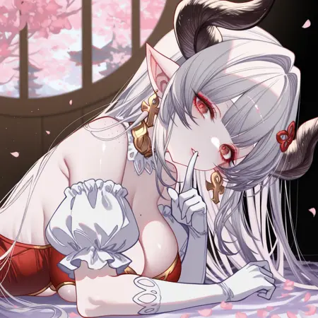 alicia (granblue fantasy),alicia \(granblue fantasy\), 1girl, ankh earrings, breasts, draph, earrings, horns, large breasts, pointy ears, blunt bangs, hair intakes, mature female, shortstack, long hair, red eyes, brown eyes, grey hair, demon horns,