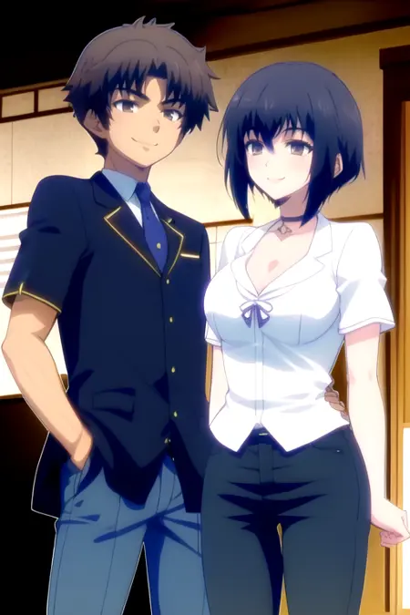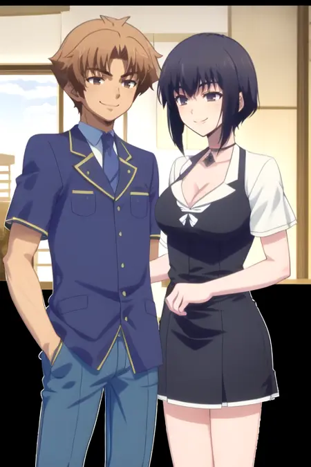 AkihisaAkira, a man and a woman, hetero, standing, smile, cowboy shot