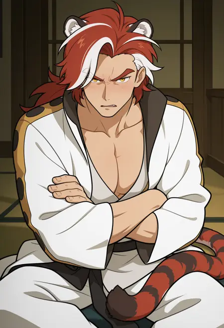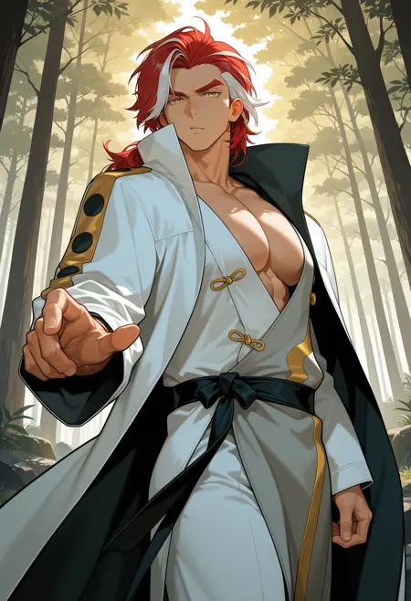 의상 프롬프트 (필요에 따라 사용): 흰 코트, 벌어진 코트, 가슴 사이의 틈, 띠, 흰 바지,