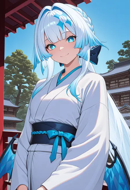 C3rydr4, blue eyes, bright pupils, multicolored hair, white hair, blue hair, long hair, ponytail, braid, hair bow, waist wings