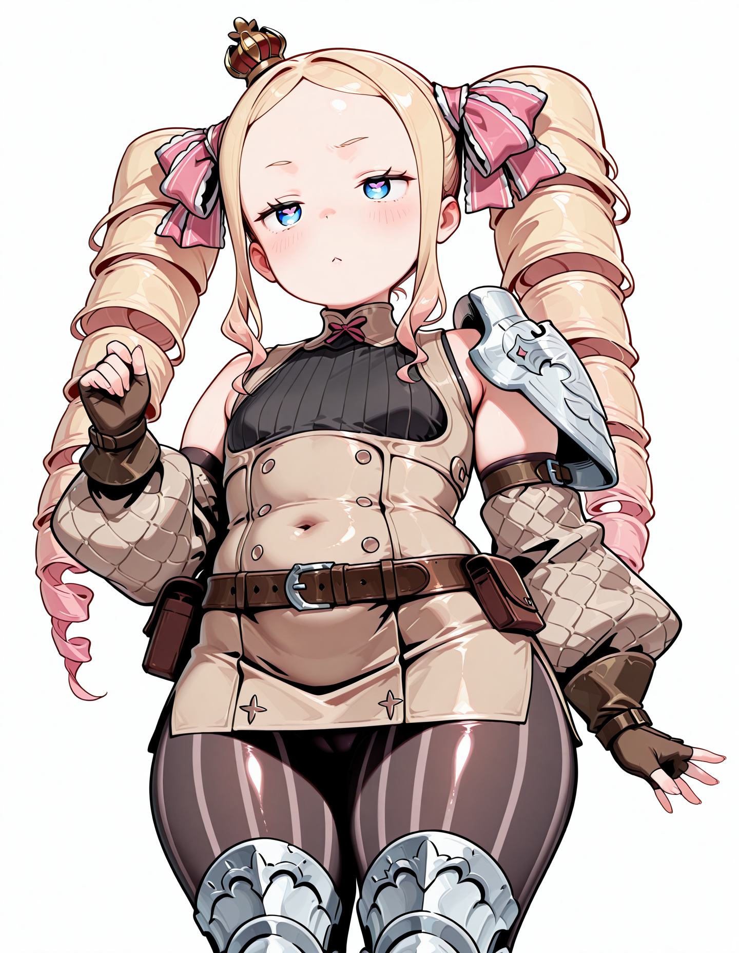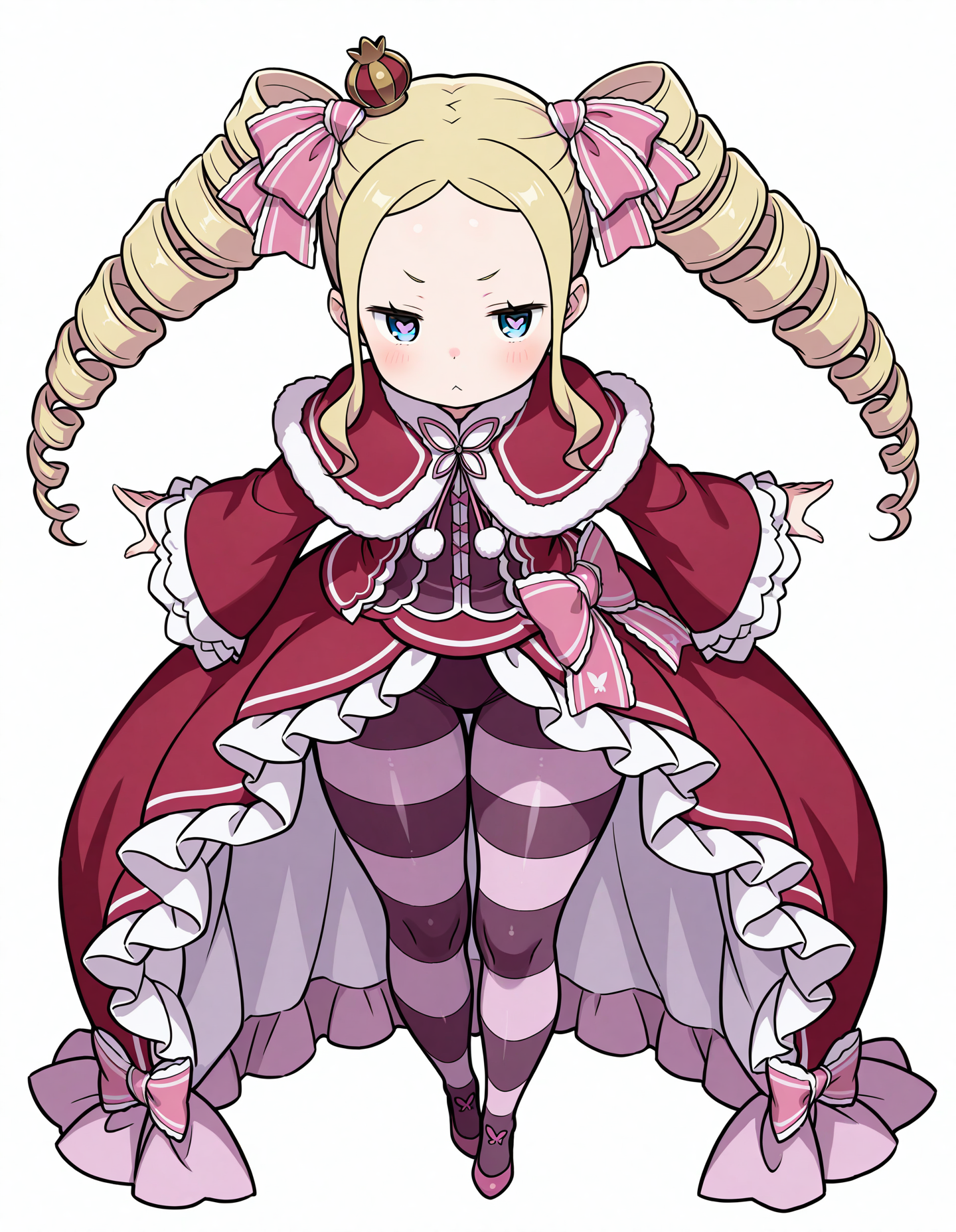 BeaZero, blonde hair, drill hair, twin drills, symbol-shaped pupils, blue eyes, hair ribbons, mini crown, red fur-trimmed capelet, bea red gown, layered dress, white frills, long wide sleeves, ribbons, striped pantyhose, pink flats,