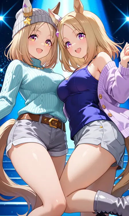narita top road,horse girl,horse ears,horse tail,short hair,blonde hair,parted bangs,bangs,medium hair,multicolored eyes,orange eyes,brown eyes,yellow eyes,purple eyes,pink eyes,long hair, breasts, médium breasts,thighs,