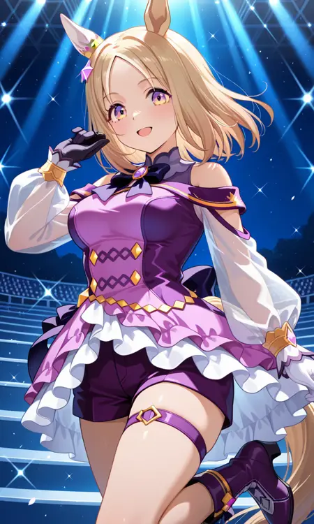 horse ears, horse tail, gloves,black gloves, parted bangs, medium hair, purple high heel boots, thigh strap, star hair ornament, purple dress, sleeveless dress, white gloves, mismatched gloves, puffy long sleeves, see-through sleeves, detached sleeves, purple short shorts, frills, brooch, shorts under dress, shoulder cutout, bow,