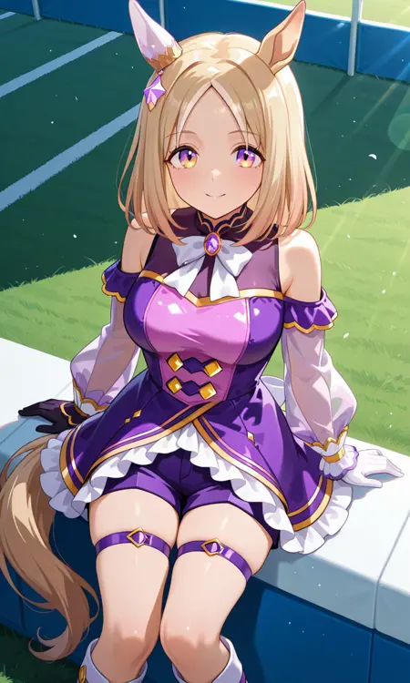 tracen school uniform, summer uniform, serafuku, puffy short sleeves, purple bowtie, horseshoe ornament, sailor collar, sailor shirt, purple shirt, white skirt, pleated skirt, frilled skirt, miniskirt, zettai ryouiki, white thighhighs, brown footwear, loafers