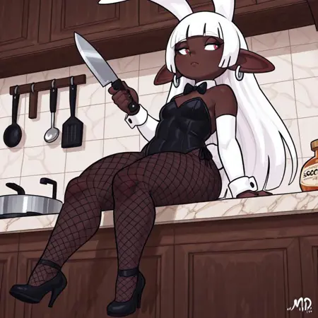 MaryM,Elf,Shortstack,Dark skinned female,Pointy ears,White pupils,Long White hair,Bangs,Silver earring,Chocker,Black drees,Thigh highs,Heels,