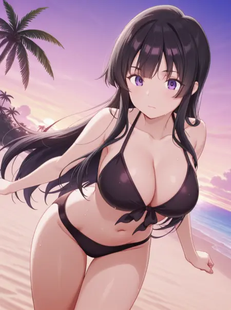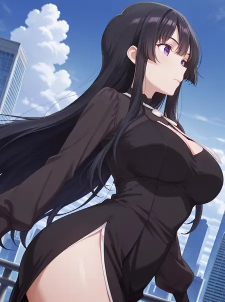 theaxd, 1girl, black hair, bangs, breasts, long hair, purple eyes,