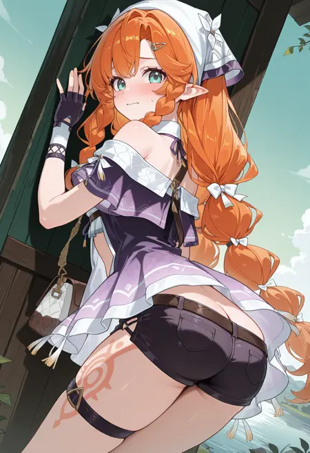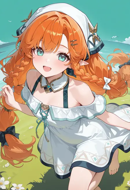 • wuwasig, orange hair, very long hair, low-tied long hair, multi-tied hair, twin braids, aqua eyes, pointy ears,