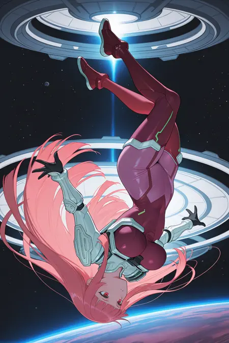 若要表现她的典型造型,请添加 "白色短袖上衣,长袖,红色紧身衣,粉色紧身衣,双色紧身衣,飞行员服,白色护腕,黑色手套,红色过膝袜,大腿靴"。